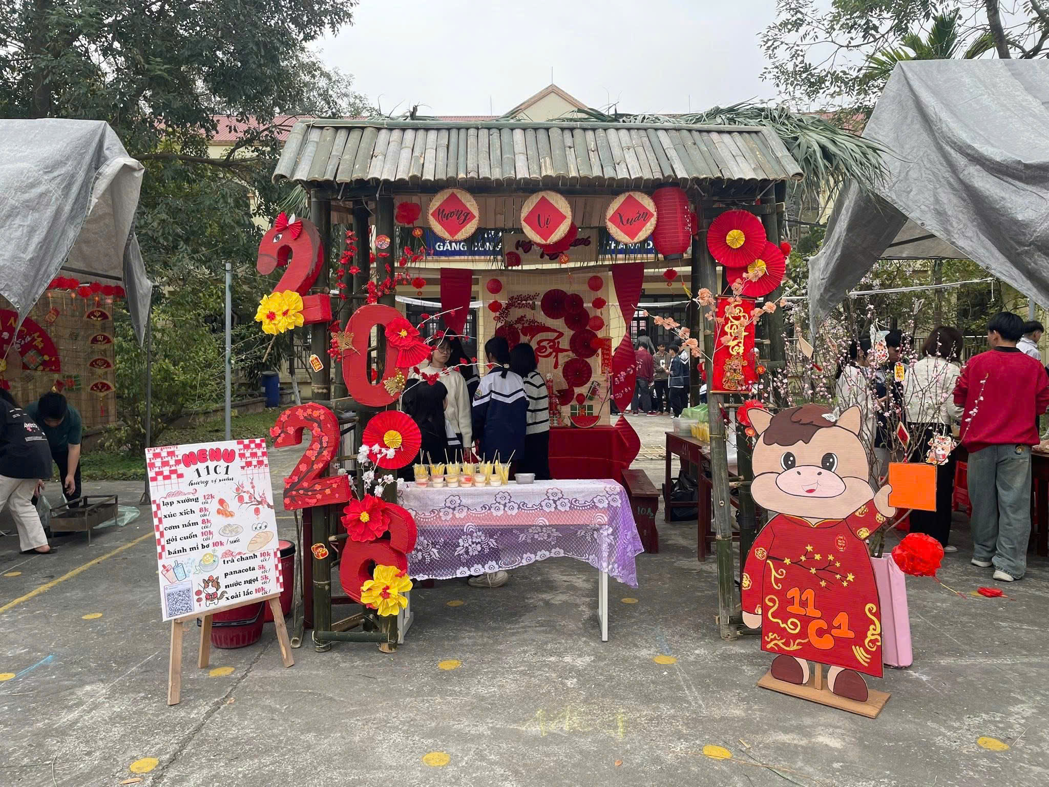 Tái hiện ngay tại sân trường một không gian “Phiên chợ quê” năm 2026 vô cùng sống động, mộc mạc mà thân thương với 21 gian hàng; Mỗi một gian hàng, học sinh chung tay trang trí sáng tạo, bày bán. Học sinh được trải nghiệm làm người bán hàng, mua hàng….Hồn quê thấm đẫm từ cách trang trí đến trang phục, từ những lời hát điệu múa, các sản phẩm mua bán trong phiên chợ…Phiên chợ quê với những món hàng bình dị, sáng tạo từ trong học tập và thực tiễn…đã tạo nên một sân chơi bổ ích, ý nghĩa đối với học sinh trong nhà trường. Đây là một hoạt động trải nghiệm sáng tạo, không chỉ mang ý nghĩa giải trí mà còn là một trải nghiệm thực tế có tác dụng rèn luyện kĩ năng sống, rèn sự mạnh dạn tự tin trong giao tiếp, kỹ năng tính toán cho học sinh, giáo dục trẻ em hướng về cội nguồn, biết yêu thương và trân trọng những giọt mồ hôi của người lao động, biết sáng tạo các sản phẩm….